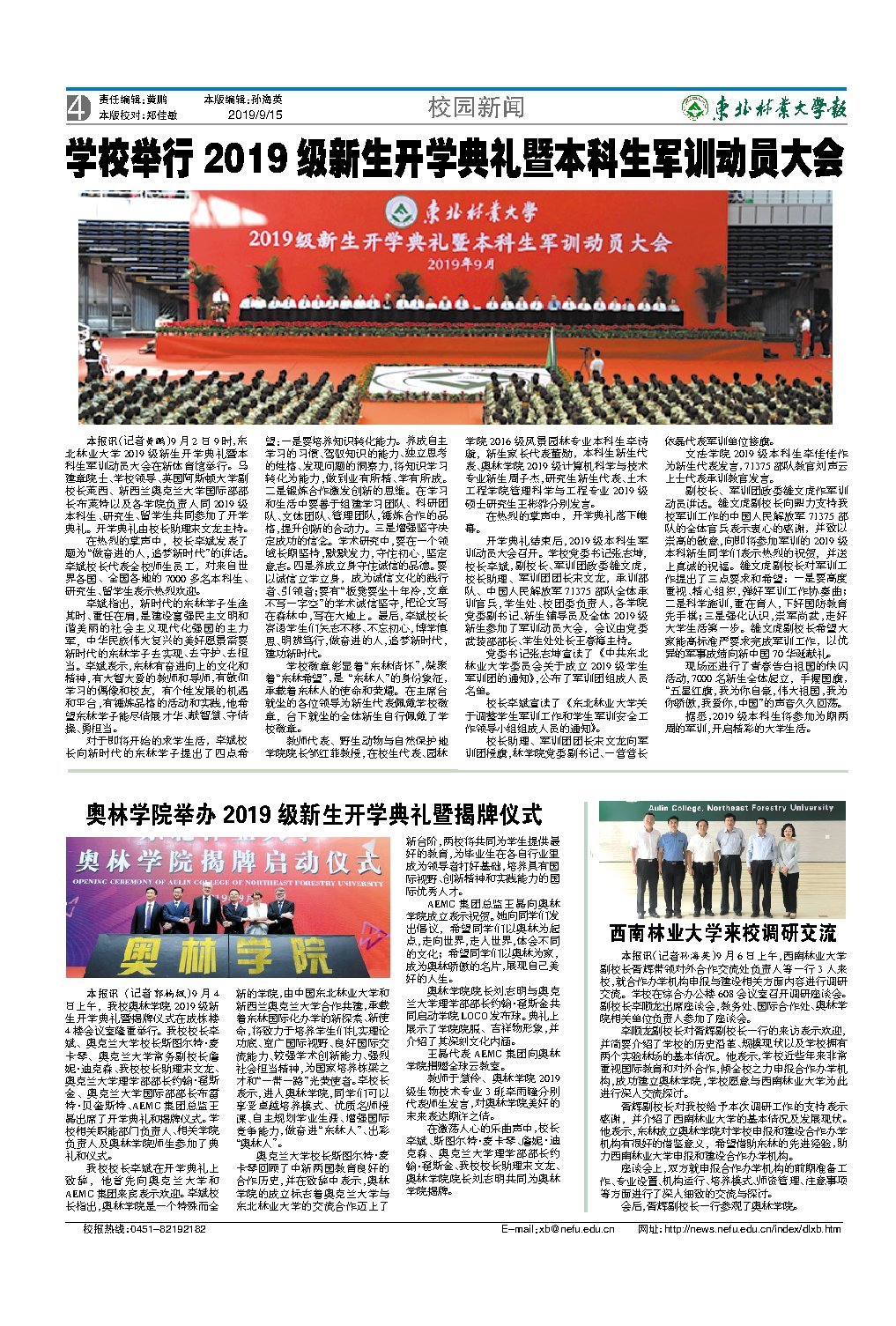 东北林业大学举行新生开学典礼暨本科生军训动员大会,李斌校长发表讲话,寄语学生们做奋进的人,追梦新时代,并在大会结束后召开了军训动员大会。新一届学生将参加为期两周的军训,开启精彩的大学生活。同时学校为新生代表佩戴学校徽章。会议中还有教官发言和快闪活动。