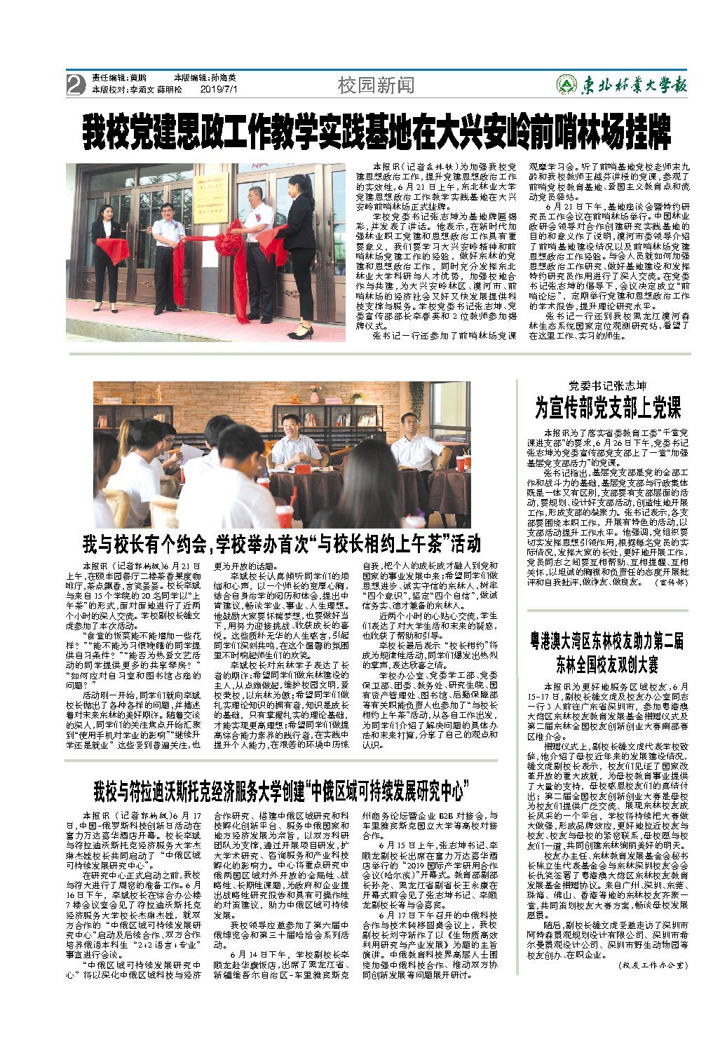 东北林业大学党建思想政治工作教学实践基地在大兴安岭前哨林场挂牌,学校党委书记张志坤表示要加强林业职工党建和思想政治工作,学习大兴安岭精神和前哨林场党建工作的经验,并加强校地合作与共建,为大兴安岭林区、漠河市、前哨林场的经济社会又好又快发展提供科技支撑与服务。会议决定成立“前哨论坛”,定期举行党建和思想政治工作的学术报告,提升理论研究水平。张书记一行还看望了在这里工作、实习的师生。