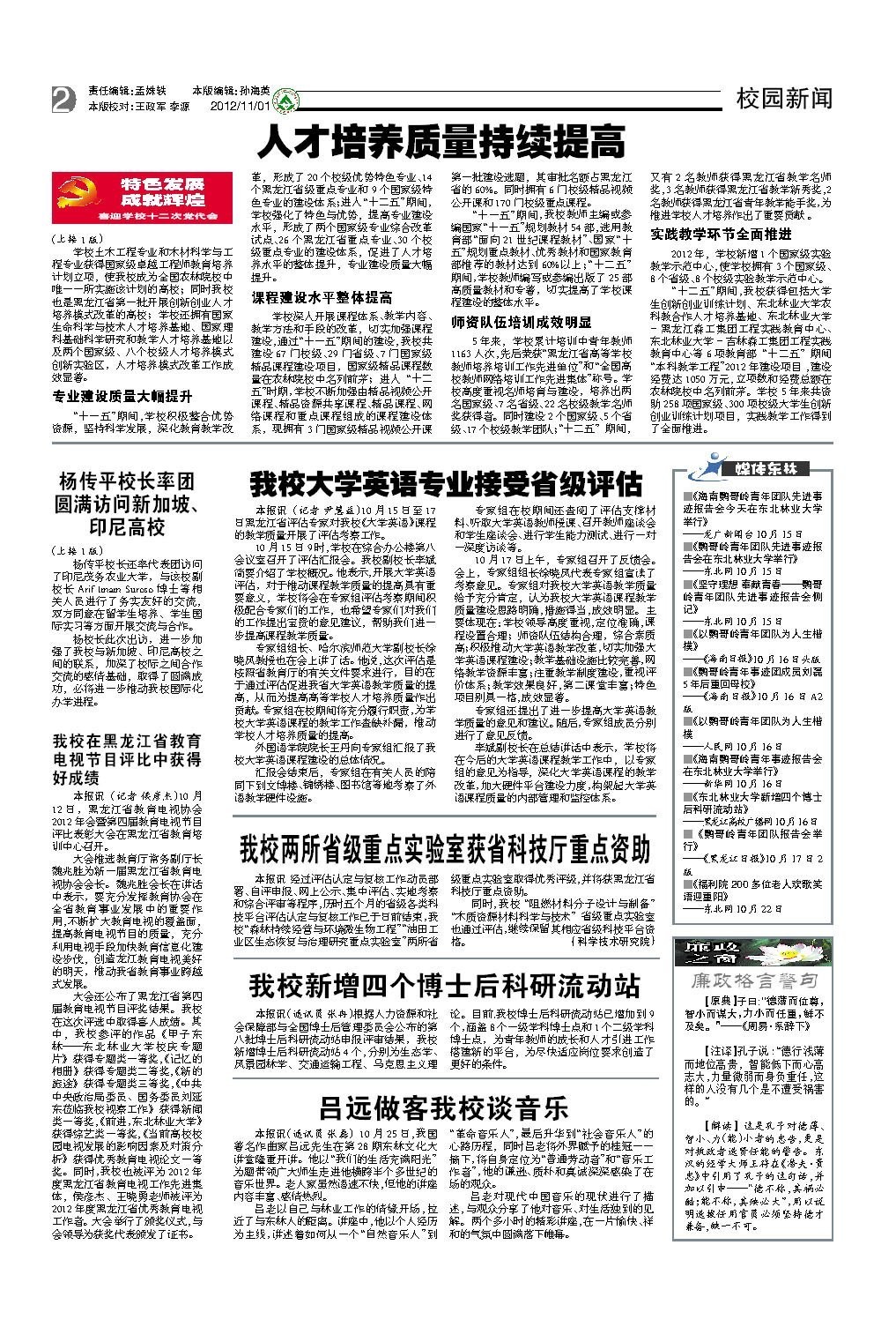 黑龙江省评估专家对我校《大学英语》课程教学质量进行了评估考察工作。专家组对我校大学英语教学质量给予充分肯定,认为我校大学英语课程教学质量建设思路明确,措施得当,成效明显。专家组还提出了进一步提高大学英语教学质量的意见和建议。学校将深化大学英语课程的教学改革,加大硬件平台建设力度,构架起大学英语课程质量的内部管理和监控体系。